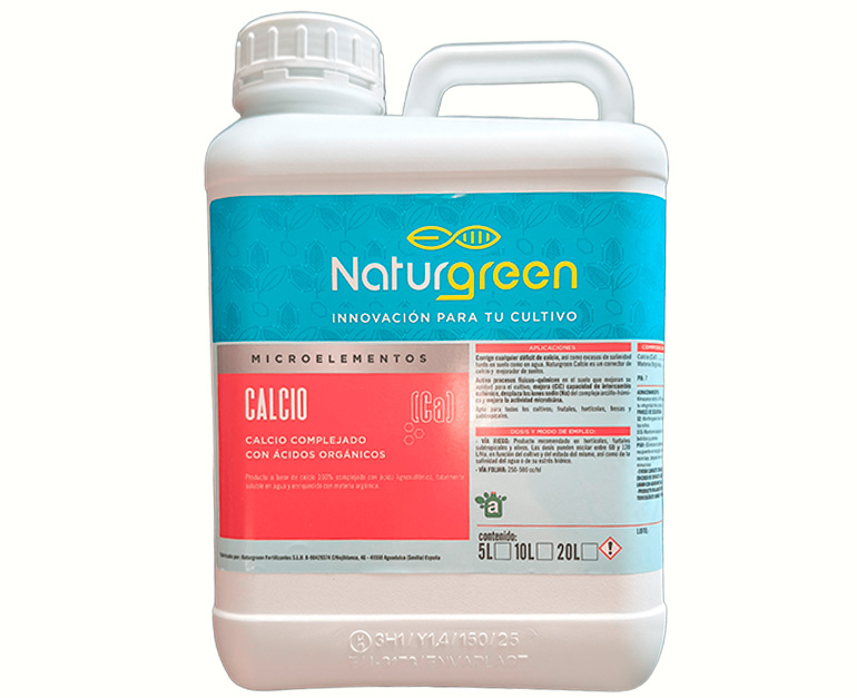 Es un producto a base de calcio 100% co mplejado con ácido lignosulfónico, totalmente soluble en agua y enriquecido con materia orgánica.  Corrige cualquier déficit de calcio, así como excesos de salinidad tanto en suelo como en agua. Naturgreen Calcio es un corrector de calcio y  mejorador de suelos. Activa procesos físicos –químicos en el suelo que mejoran su aptitud para el cultivo; mejora (CiC) capacidad de intercambio catiónico, desplaza los iones sodio (Na) del complejo arcillo-húmico y mejora la actividad microbiána. Apto para todos los cultivos; frutales, hortícolas, fresas y subtropicales.